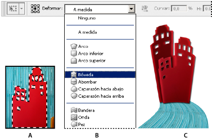 - Selección de un estilo de deformación del menú emergente Deformar de la barra de opciones